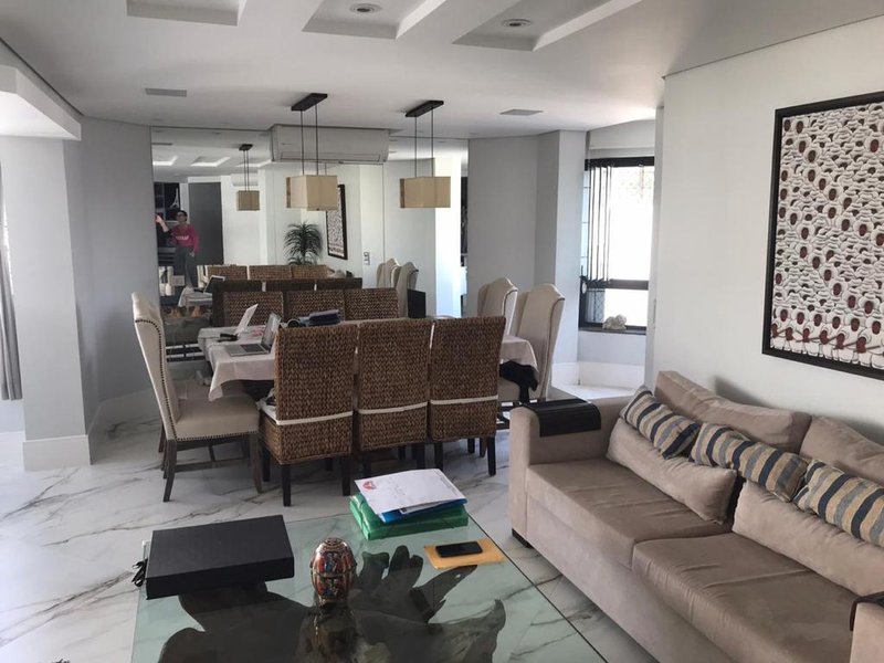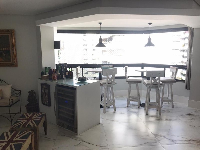 São 3 suítes, varandas fechadas com vidro, varanda para condensadoras de ar condicionado quente e frio, lareira, home theater, automação de iluminação, persianas, e som, autofalantes embutidos no teto.